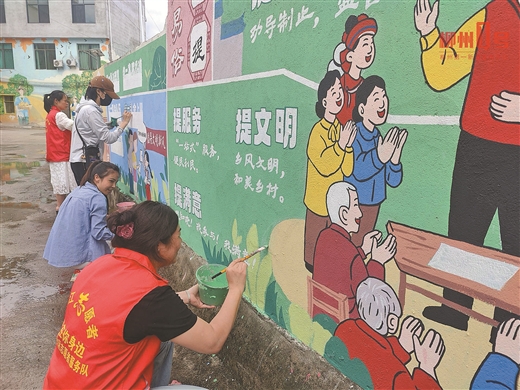 志愿者和村民共同绘制文明新风主题墙绘。记者 彭华 通讯员 韦莹芸 摄