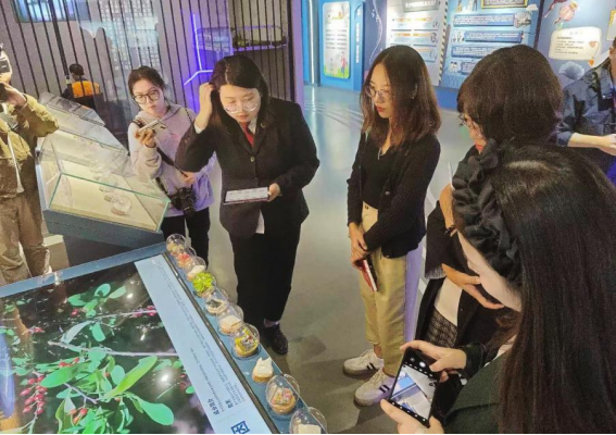 在渠县人民检察院未成年人法治教育基地,讲解员正在为参观者普及毒品知识(11月2日摄)。新华网 李然 摄