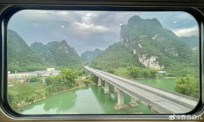 贵南高铁列车窗外一派绿水青山风光。
