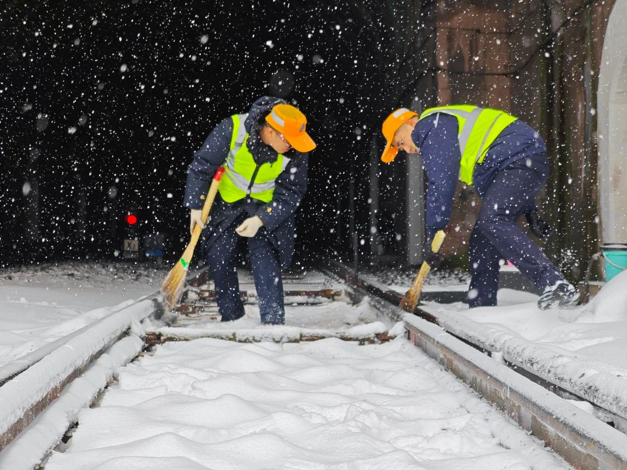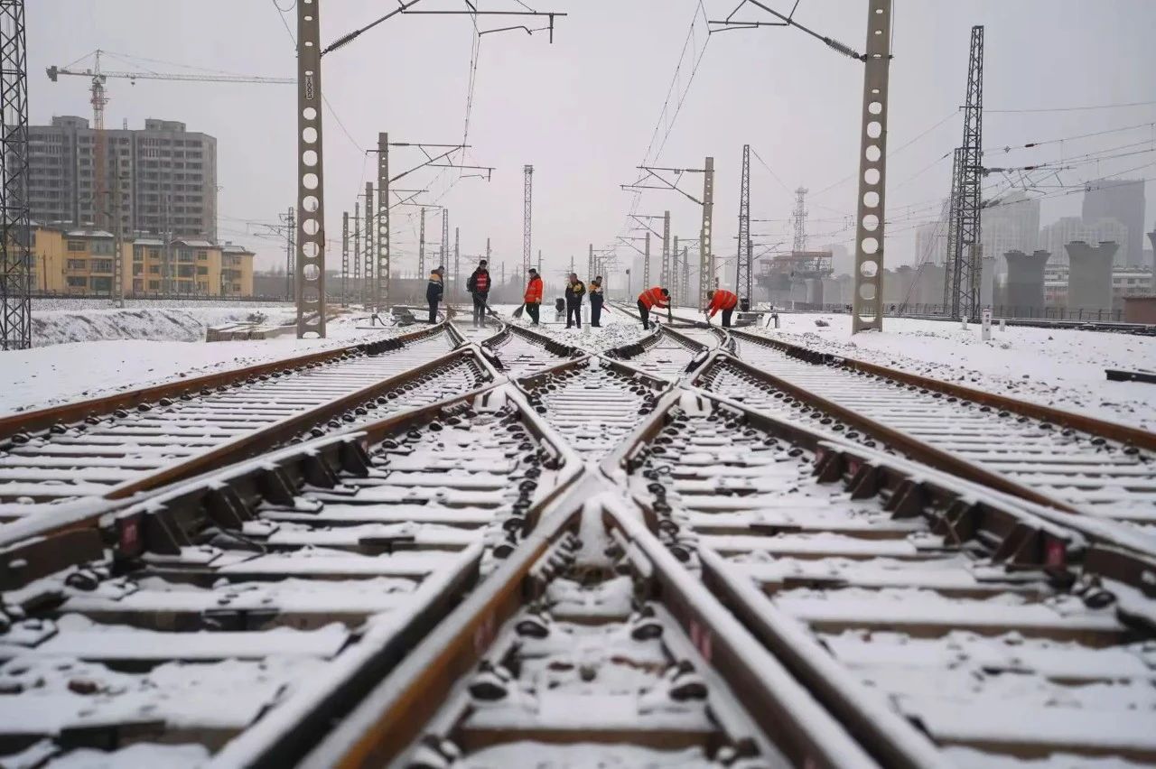 陕西宝鸡青石崖车站职工进行道岔积雪清扫。