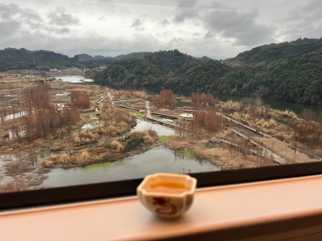 品茗赏景,旅客在由江西景德镇开往南昌的G4415次列车上拍下沿途风光。