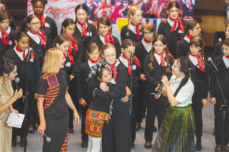 在五指山市水满乡毛纳村,五指山黎苗童声合唱团与法国巴黎宝丽声童声合唱团成员互相拥抱。海南日报全媒体记者 李天平 摄