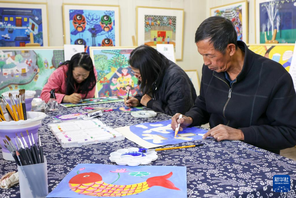 10月27日,在江苏省兴化市垛田街道新时代文明实践所,垛田农民画创作爱好者在创作作品。新华社发(史道智 摄)