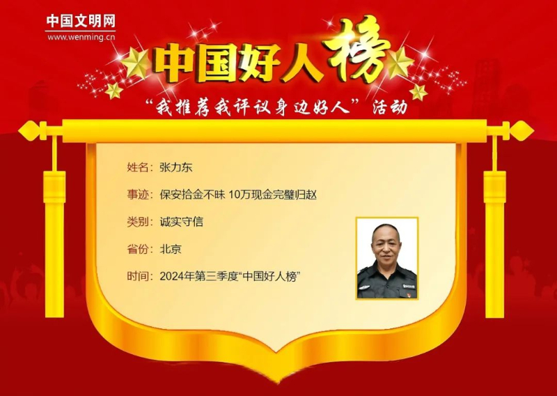 张力东,男,1970年7月生,中共党员,北京安铁保安公司三里屯工体南路东段排水大院保安班班长。1990至1994年,张力东在沈阳军区某支队服役,曾获个人三等功一次,集体三等功两次。因拾金不昧的感人事迹,曾荣登2024年第三季度“中国好人榜”。